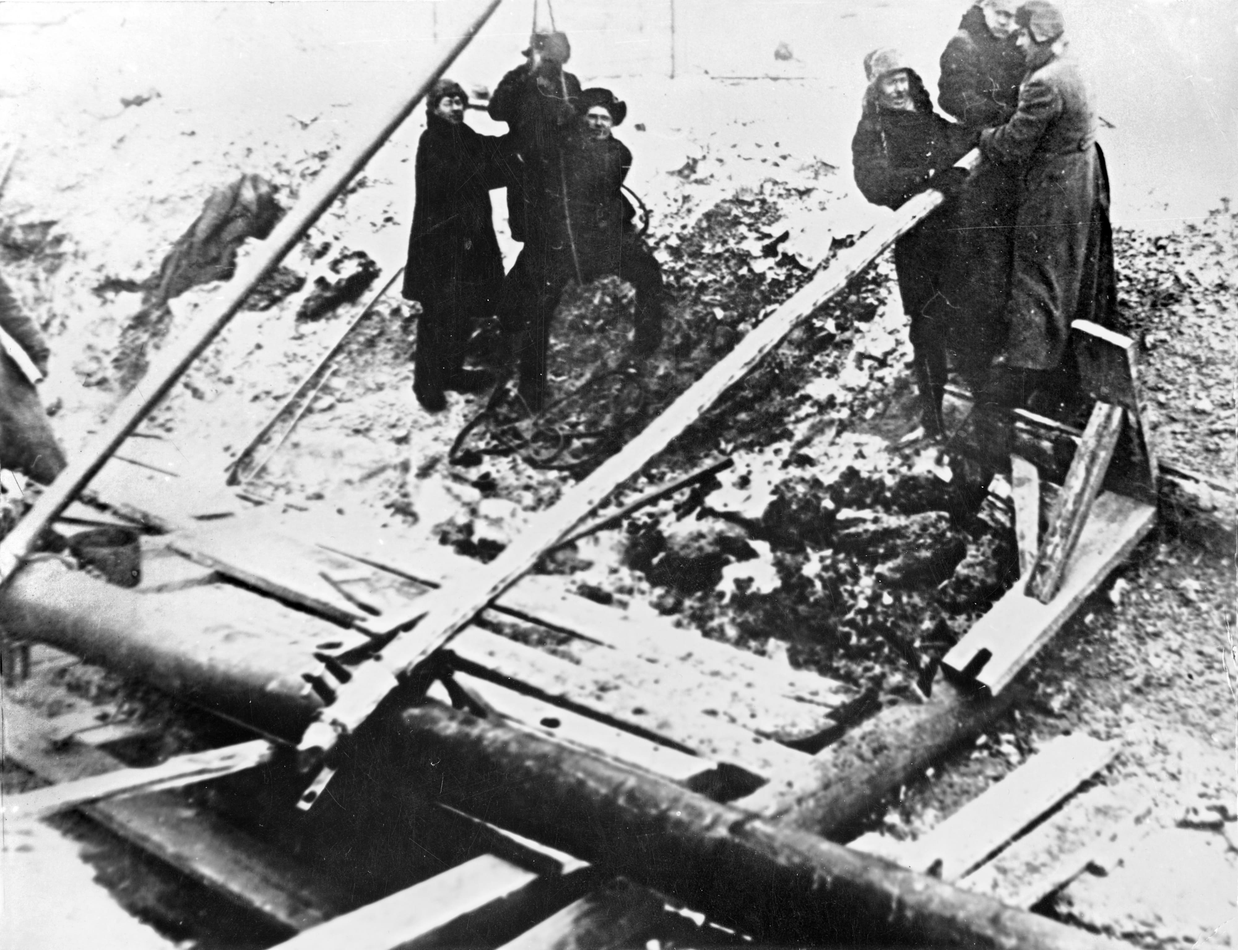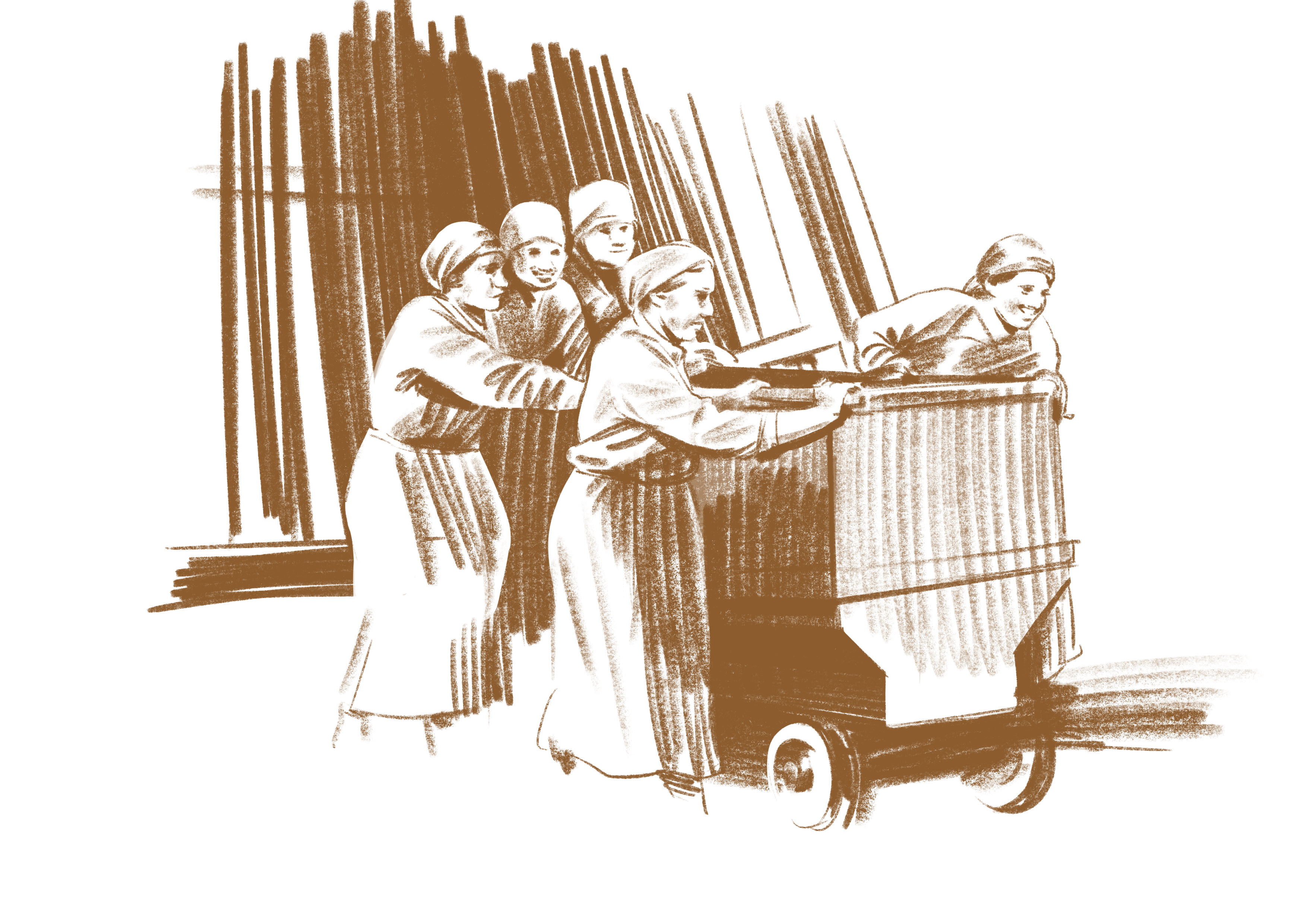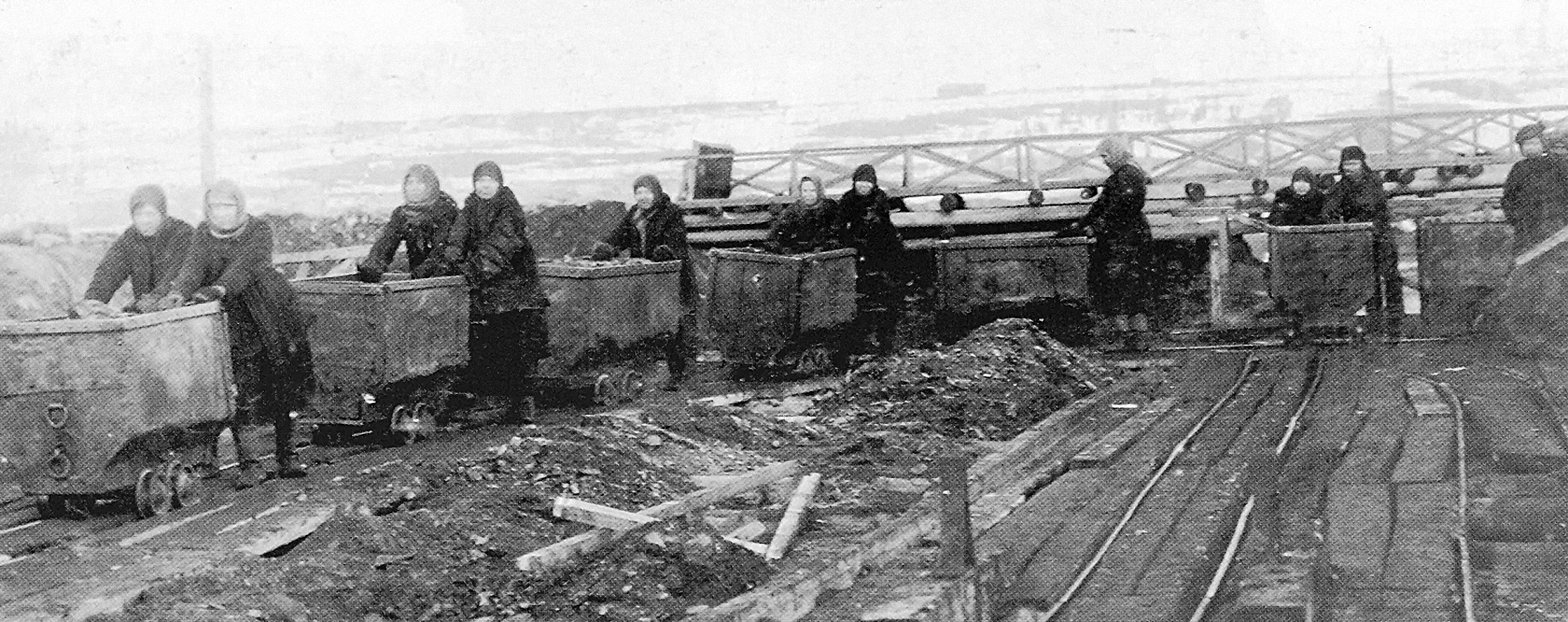 Женщины-откатчики толкали вагонетку с рудой по рельсам. В шахте холодно и сыро, одежда была грязной, промокшей. Потом спешили домой, чтобы её сменить, если не оставались ночевать в шахте. Зимой влажная спецовка замерзала на улице, приходилось у печки ждать, пока лёд растает, и можно будет снять куртку.