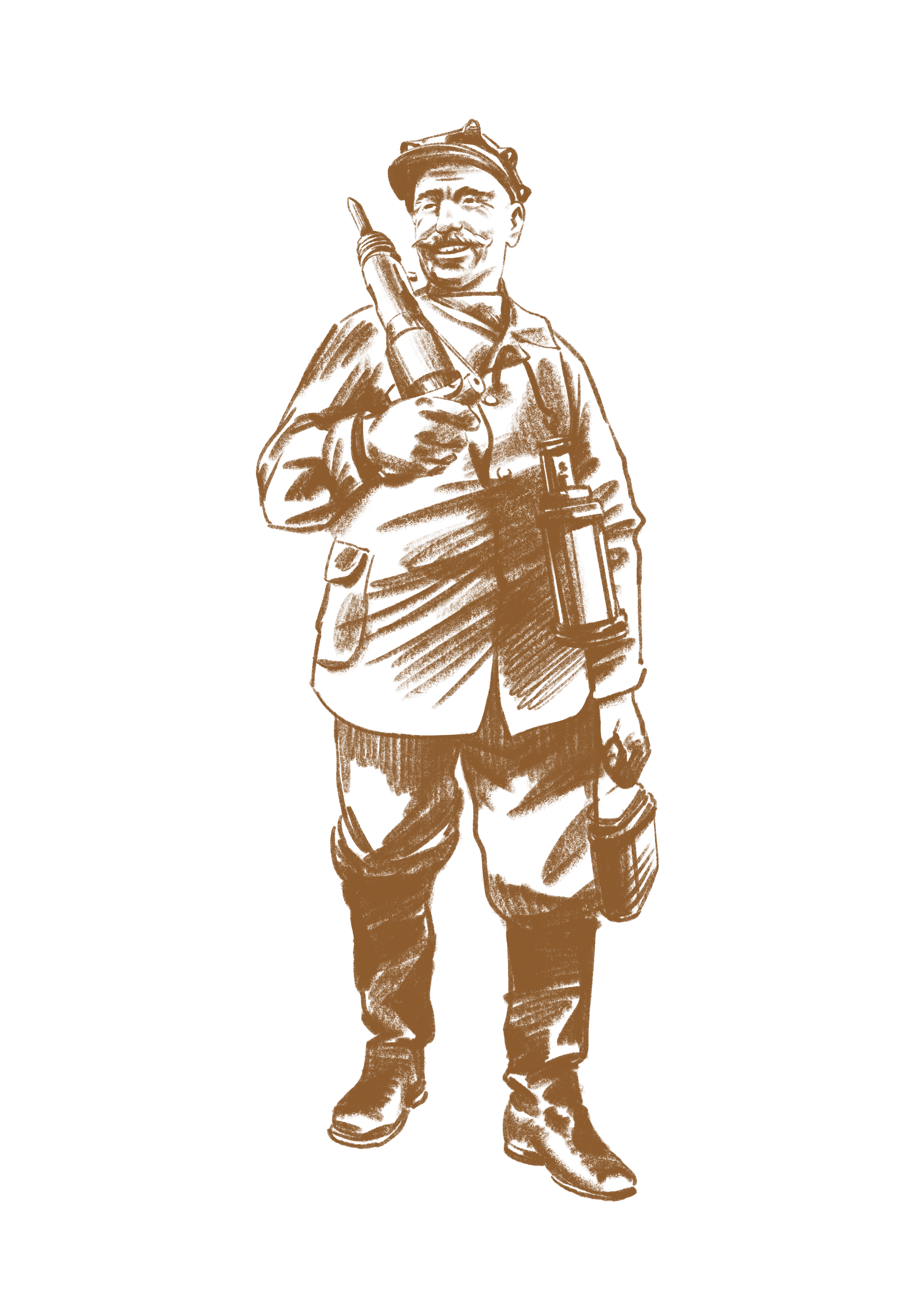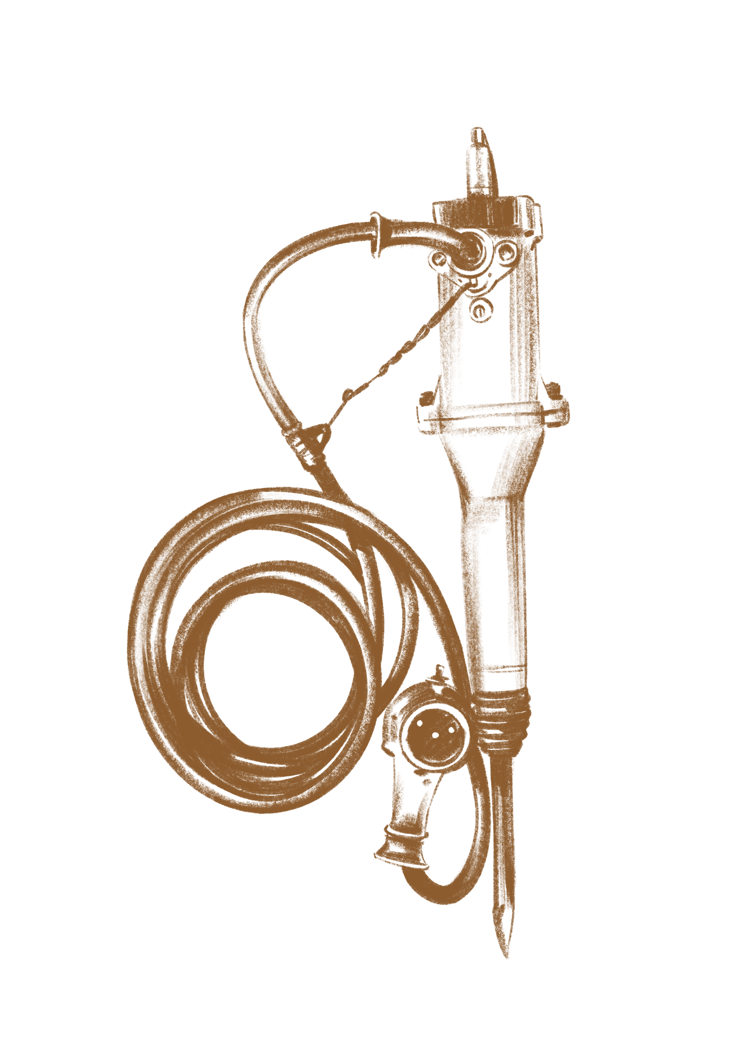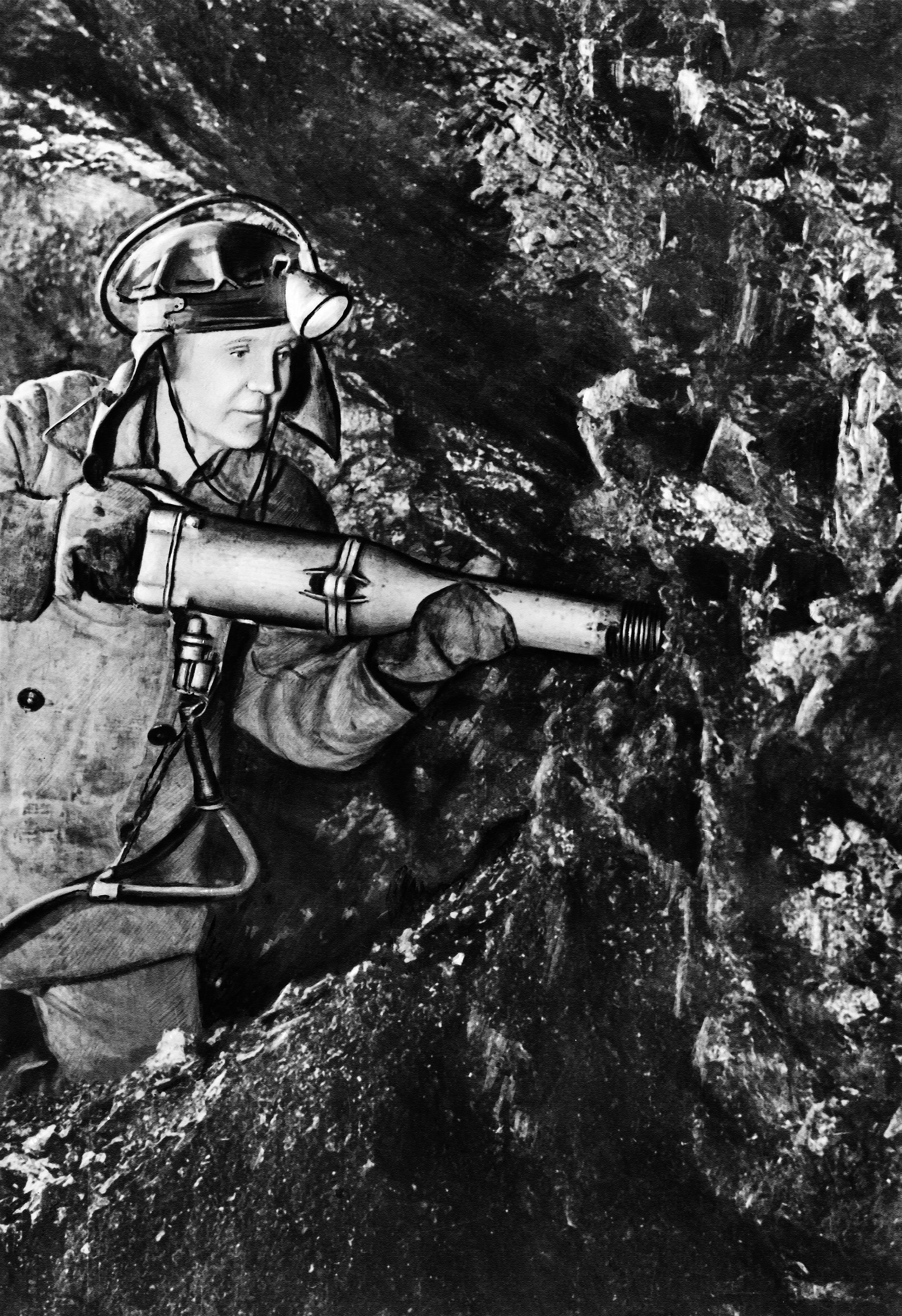 Отбойный молоток — это пневматический ручной инструмент ударного действия, предназначенный для выемки угля и других пластовых месторождений. В СССР до 1930 г. пневматические отбойные молотки не производились. Но в связи с ростом угольной промышленности возникла необходимость в создании отечественного инструмента. Крупнейшим по объёму производства стал Томский электромеханический завод им. Вахрушева (ТЭМЗ). В 1941–1945 гг. завод был единственным производителем горных машин, электро- и пневмоинструмента во всём Советском Союзе. Самые популярные модели КНШ-3 и КНШ-4. Вес 10,7 кг! Так как многие горняки ушли на фронт, на их место пришли пожилые люди, подростки, молодые девушки и женщины. Работали по 12–16 часов без выходных и отпусков, бывало, что не выходили на поверхность по несколько суток. Каждый стремился дать больше нормы: за себя и за ушедшего на фронт товарища. Некоторые забойщики умудрялись вырубать за смену свыше 100 тонн угля — в 14 раз больше нормы